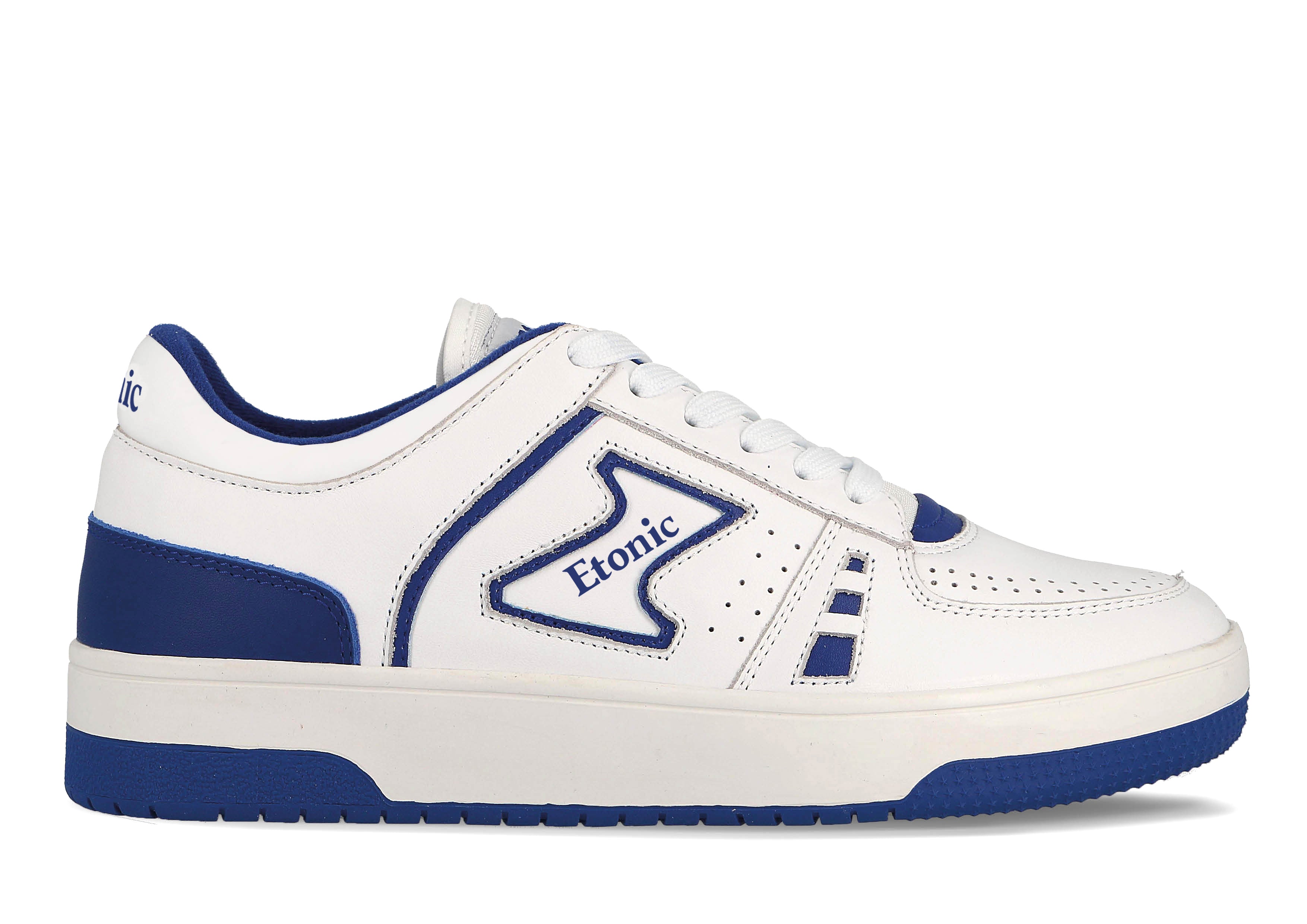Baskets Etonic B509 en cuir blanc avec col en toile blanche, détails noirs et dorés et languette en mesh blanc